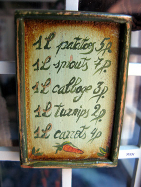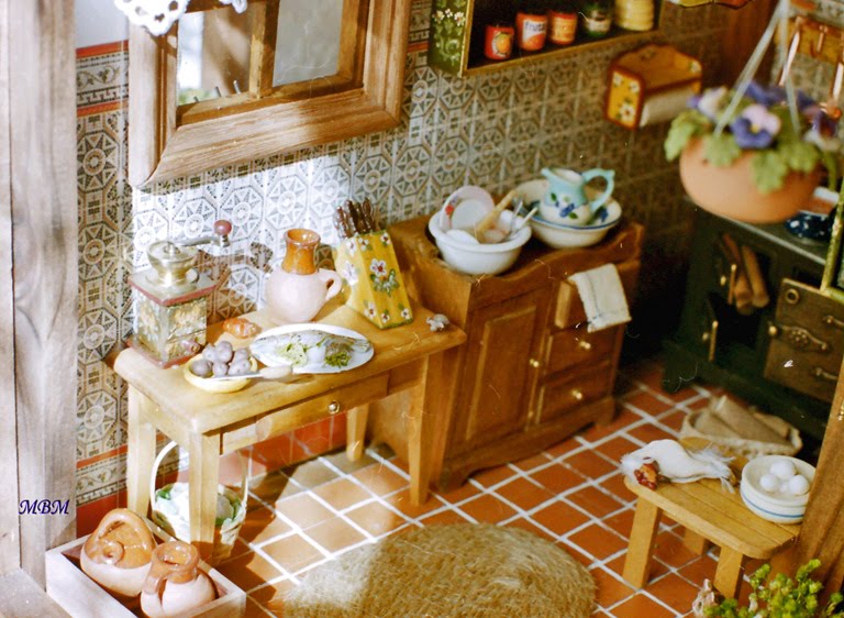 Detalles de la cocina, con el fregadero hecho a partir de un kit, cosas pintadas, alimentos...Un pollo a medio pelar reposa en el taburete, esperando el fin de la "faena"...