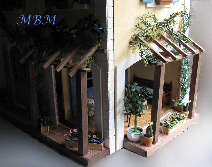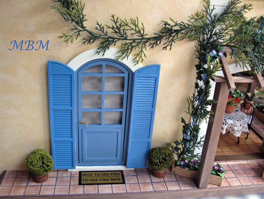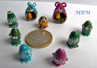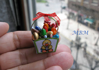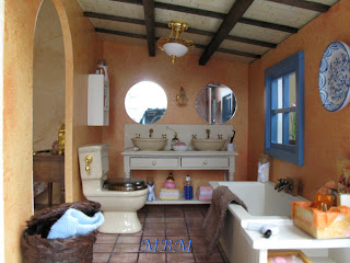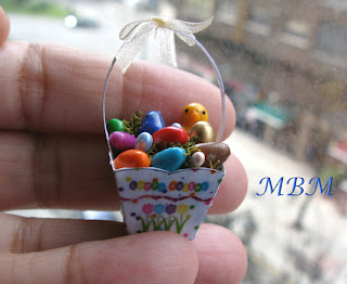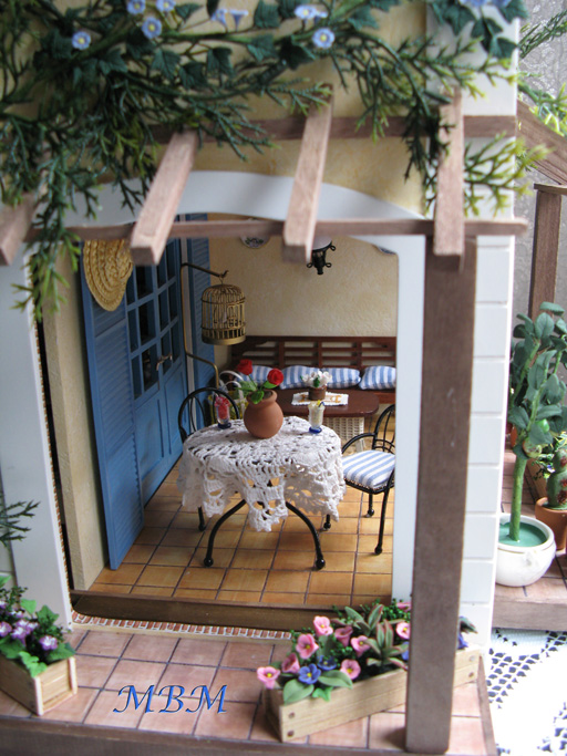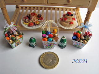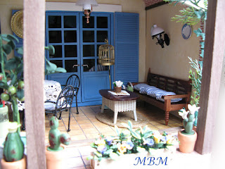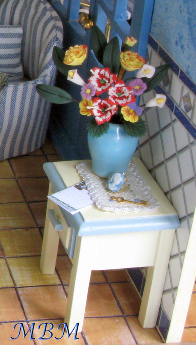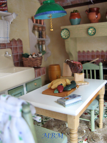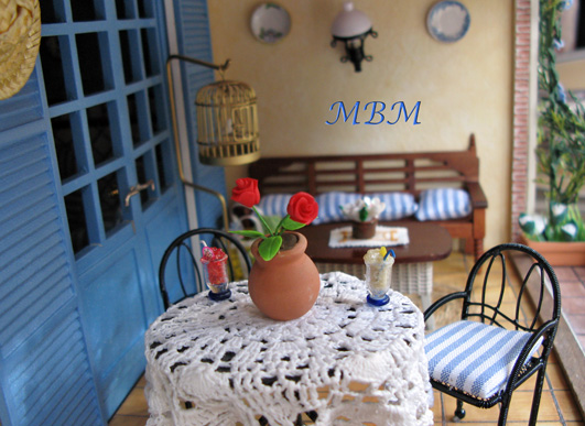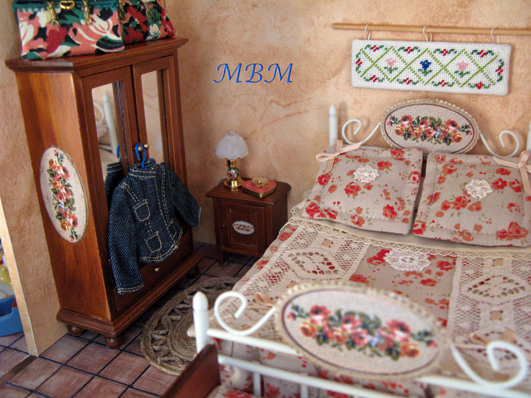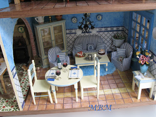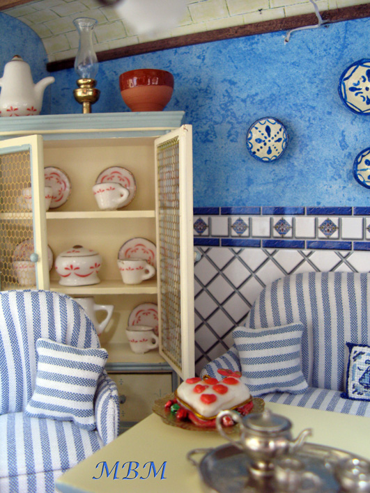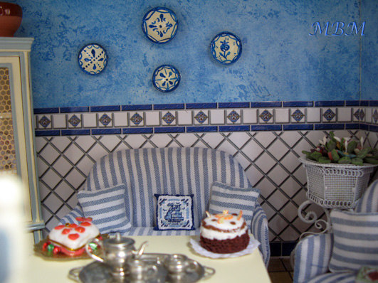 Al fondo, en la pared, unos platos hechos y pintados a mano, en el sofá un diminuto cojín bordado a punto de cruz y un par de tartas que hice en Fimo, esperando que llegue la hora del postre...
