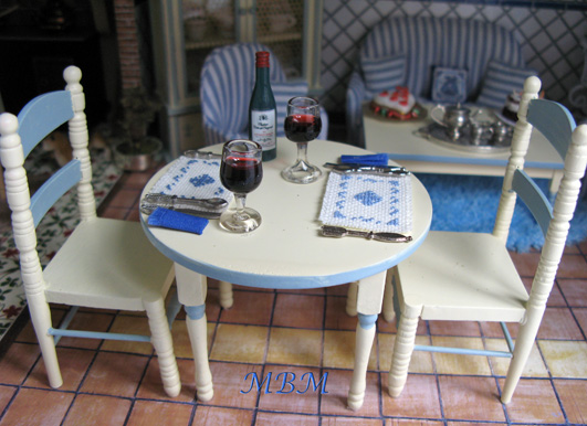 Y finalmente, en la mesa, dos manteles de hilo bordados a punto de cruz, mas un buen Rioja para ir tomando mientras llega la comida...