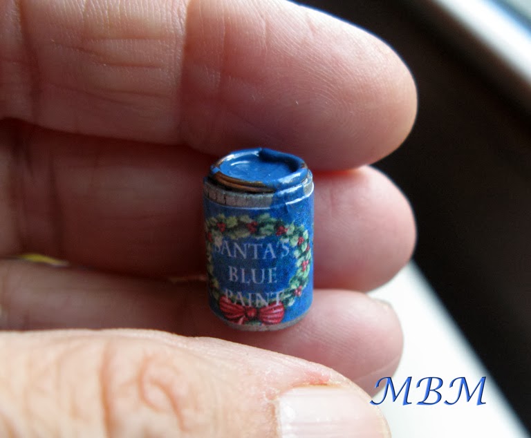 Le hice también unos botes de pintura personalizados, un recipiente con pinceles y trapos, un quinqué para iluminar las oscuras noches del Polo Norte y unas cajas con muñecos...