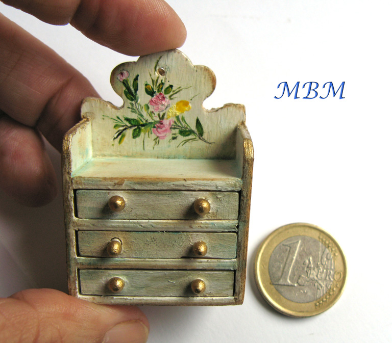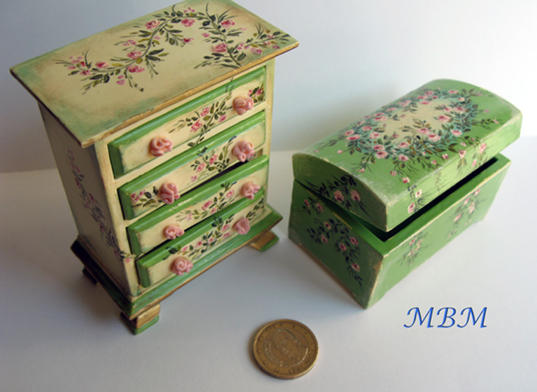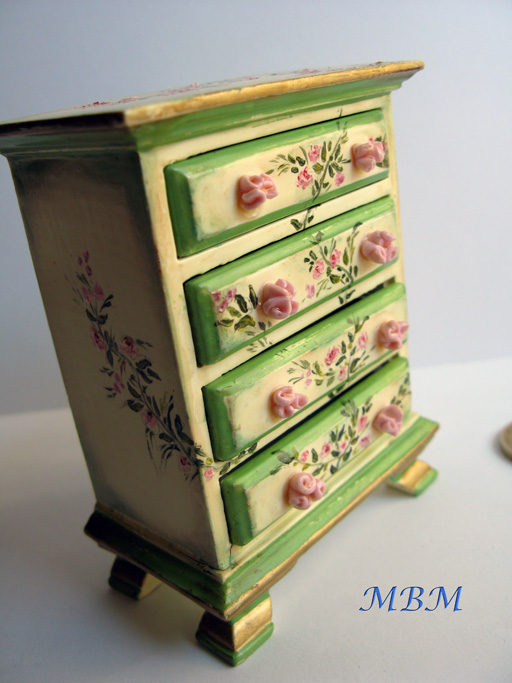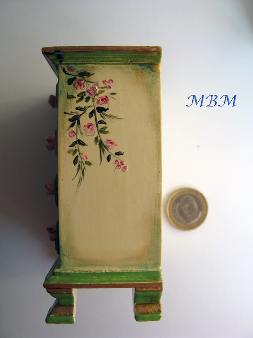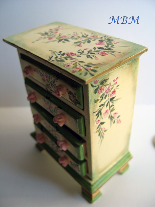 En la cajonera, las ramas floridas nacen en la base del mueble, por el que van trepando hasta la tapa y los lados...