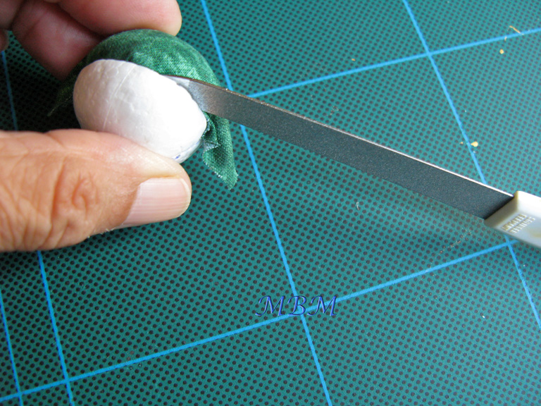 Cortar el palito dándole una altura proporcionada al tamaño de la base y la bola que estamos usando y clavarlo por un lado en la maceta y por otro en la base de la bola de porexpan ya forrada, dando un poco de cola blanca para asegurar la sujeción en ambos extremos.