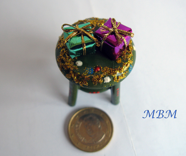 La otra, sobre fondo verde, lleva guirnaldas de espumillón y figuras navideñas variadas, y el terciopelo también va a juego con la pintura...