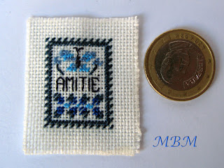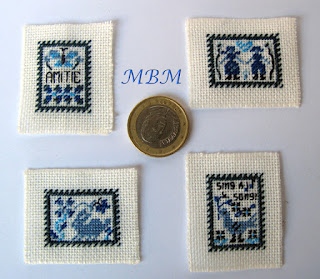 Bordados a medio punto en Lugana 25, con dos hebras de hilo de madejas DMC en varios tonos de azul.